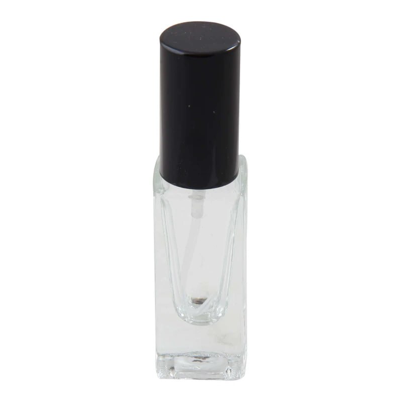 شیشه عطر ساده حجم ۷.۵ میلی‌لیتر با بدنه شیشه‌ای و اسپری پلاستیکی بدون نشتی، مناسب نگهداری عطر، الکل و مایعات معطر.