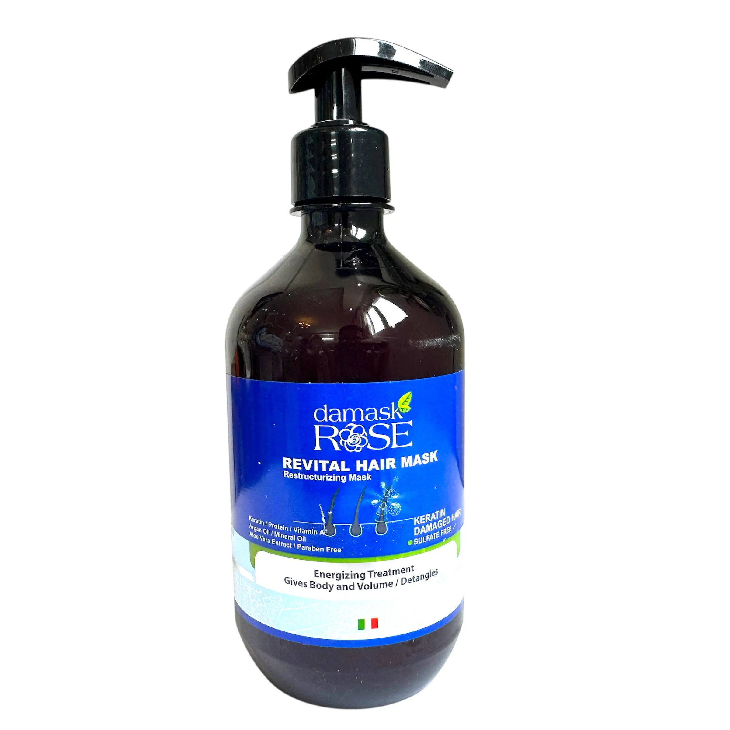 ماسک موی داخل حمام کراتینه داماسک رز با حجم ۵۰۰ میلی‌لیتر، یک درمان عمقی برای موهای آسیب‌دیده بر اثر رنگ، دکلره و حرارت است. این ماسک با فرمولاسیون فاقد سولفات و پارابن، ضمن حفظ سلامت ساقه مو، به ترمیم، آبرسانی و بازسازی ساختار مو کمک می‌کند. ترکیبات مؤثر مانند کراتین، پروتئین، ویتامین E، روغن آرگان و آلوئه‌ورا باعث افزایش نرمی، درخشندگی و کاهش وز و موخوره می‌شوند. محصول تحت لیسانس ایتالیا تولید شده و برای استفاده داخل حمام طراحی شده است.